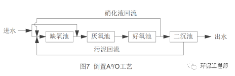與常規(guī)的A2/O工藝相比,倒置A2/O工藝(見(jiàn)圖7)從前往后以此為缺氧-厭氧-好氧,該工藝的設(shè)計(jì)初衷是為了降低污泥回流中硝態(tài)氮對(duì)厭氧釋磷的影響,特別是對(duì)于高氨氮廢水污泥回流中攜帶有大量的硝氮,抑制厭氧釋磷反應(yīng)。同時(shí),為了解決碳源分配的問(wèn)題,采用兩點(diǎn)進(jìn)水的方式來(lái)提供厭氧釋磷中有機(jī)物的消耗。