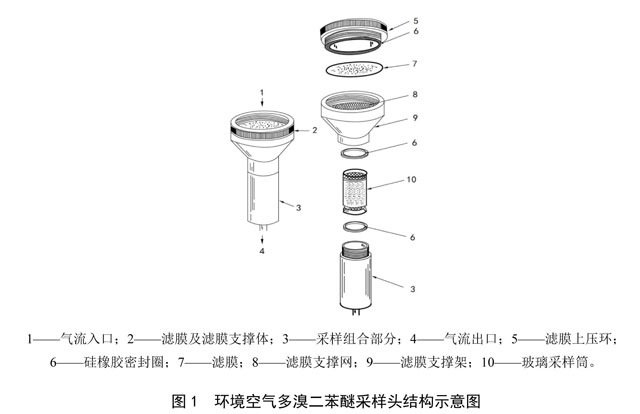 按HJ 194和HJ 691要求采樣,應對采樣現(xiàn)場的氣溫、氣壓、風速、風向等氣象參數(shù)進行測定,并對采樣過程中的技術參數(shù)進行記錄。采樣前確認石英/玻璃纖維濾膜(5.17)無破損后用鑷子輕輕夾住濾膜邊緣安裝在濾膜支撐網(wǎng)上,玻璃采樣筒安裝2塊 PUF(5.18),并安裝到采樣組合部分,按圖1依次安裝采樣頭,然后將采樣頭安裝在采樣器上并確保儀器穩(wěn)固。每次采樣前應進行采樣系統(tǒng)的氣密性和儀器運行穩(wěn)定性等檢查,確保儀器符合要求后再進行采樣。采樣結(jié)束后,關閉電源,卸下采樣頭,將采樣頭帶到干凈、無污染和避光的地方,取下濾膜,采樣塵面向里對折,取出玻璃采樣筒。兩者分別用鋁箔包好,放入保存盒中密封保存。采樣后的濾膜和PUF為環(huán)境空氣樣品。