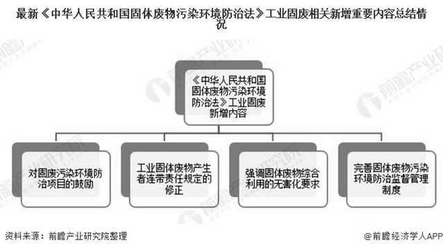 2020年4月29日,十三屆全國人大常委會第十七次會議審議通過了修訂后的固體廢物污染環(huán)境防治法,自2020年9月1日起施行,對工業(yè)固廢新增了四大類內(nèi)容可歸結(jié)為:對固廢污染環(huán)境防治項目的鼓勵、工業(yè)固體廢物產(chǎn)生者連帶責(zé)任規(guī)定的修正、強(qiáng)調(diào)固體廢物綜合利用的無害化要求、完善固體廢物污染環(huán)境防治監(jiān)督管理制度。