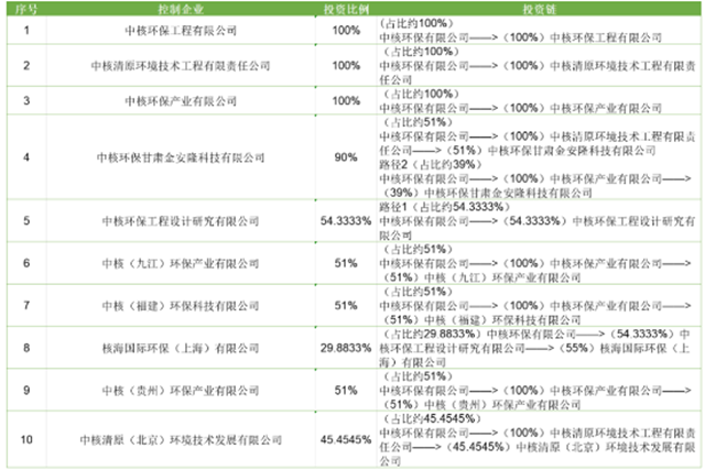 中國水網(wǎng)發(fā)現(xiàn),在中核環(huán)保所控制的27家企業(yè)中,環(huán)保企業(yè)共10家,包括中核清原環(huán)境技術(shù)工程有限責(zé)任公司,以及中核環(huán)保工程有限公司、中核環(huán)保產(chǎn)業(yè)有限公司、中核環(huán)保甘肅金安隆科技有限公司等,具體公司名稱、投資比例、投資鏈見下表。