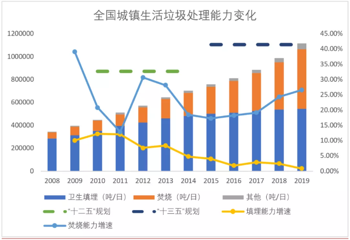 隨著我國經(jīng)濟(jì)的發(fā)展、城鎮(zhèn)化進(jìn)程的加速,城鎮(zhèn)規(guī)模和人口數(shù)量急劇膨脹,城市垃圾產(chǎn)生量激增,“垃圾圍城”已給眾多地方政府的城市管理工作帶來巨大壓力,尋找有效的解決辦法已迫在眉睫。近年來,在中央政策和資金的支持下,地方政府加大了對(duì)垃圾處理的投入,我國生活垃圾處理行業(yè)取得了快速的發(fā)展。國家發(fā)展與改革委、住房城鄉(xiāng)建設(shè)部發(fā)布的《“十三五”全國城鎮(zhèn)生活垃圾無害化處理設(shè)施建設(shè)規(guī)劃》(下稱“十三五”規(guī)劃)中制定了明確的生活垃圾無害化處理任務(wù)。同時(shí)制定了配套的投資計(jì)劃,“十三五”期間,全國城鎮(zhèn)生活垃圾無害化處理設(shè)施建設(shè)總投資預(yù)計(jì)2518.4億元,較“十二五”期間增長195%。