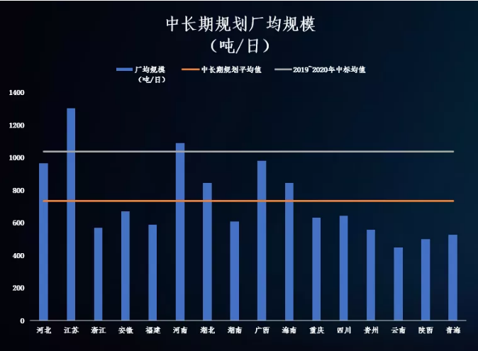 E20研究院通過對(duì)各省中長期規(guī)劃的分析發(fā)現(xiàn),中長期規(guī)劃中新增生活垃圾焚燒項(xiàng)目的廠均規(guī)模已將從2019~2020年的平均值1037噸/日下降至736噸/日,降幅達(dá)到30%。