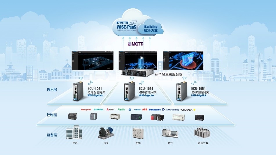 隨著能源的日益匱乏及國家碳中和碳達標的相關(guān)政策引導,各地政府要求區(qū)域內(nèi)企業(yè)在新建辦公地時,要實現(xiàn)建筑智能化。研華Ibuilding解決方案使用ECU-1051物聯(lián)網(wǎng)關(guān),通過Modbus/TCP協(xié)議對PLC設(shè)備進行數(shù)據(jù)采集,并以4G的方式通過MQTT協(xié)議將數(shù)據(jù)傳至云平臺,藉由研華輕量化服務器建立私有化布署,實現(xiàn)對于建筑供配電系統(tǒng)、冷熱源系統(tǒng)、暖通系統(tǒng)、電梯、消防、水、門禁等系統(tǒng)的實時監(jiān)控與管理,實現(xiàn)遠程運維,減輕運維成本,同時對于能耗設(shè)備的有效管理,減少的不必要的費用能源損耗。