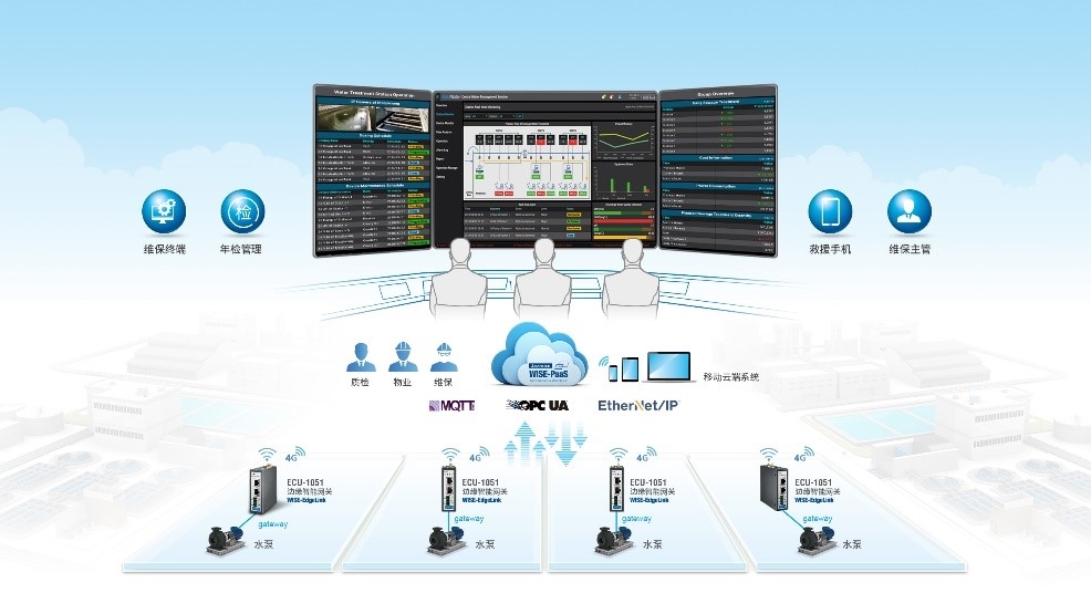 當前很多的泵站監(jiān)控仍以人工方式進行現(xiàn)場啟停,誤操作/延遲操作等情況時有發(fā)生,導致監(jiān)測不精準,監(jiān)管不到位,事故頻發(fā)。研華ECU-1051系列智能網(wǎng)關(guān)支持多種型號的PLC控制器的數(shù)據(jù)采集,并可以通過MQTT協(xié)議直接對接運營商所選的云平臺Webaccess為BS架構(gòu)組態(tài)軟件,有效采集、展示、分析數(shù)據(jù)。通過遠程控制方式對于現(xiàn)場設(shè)備進行實時、準確的監(jiān)測及故障預警,遠程分級監(jiān)控管理設(shè)備狀況,實現(xiàn)設(shè)備、人、數(shù)據(jù)、流程的互聯(lián)互通,無縫對接企業(yè)ERP/CRM/手機APP系統(tǒng)遠程資產(chǎn)管理設(shè)備位置信息建立產(chǎn)品知識庫,優(yōu)化產(chǎn)品性能及供應鏈管理,提高產(chǎn)品競爭力。