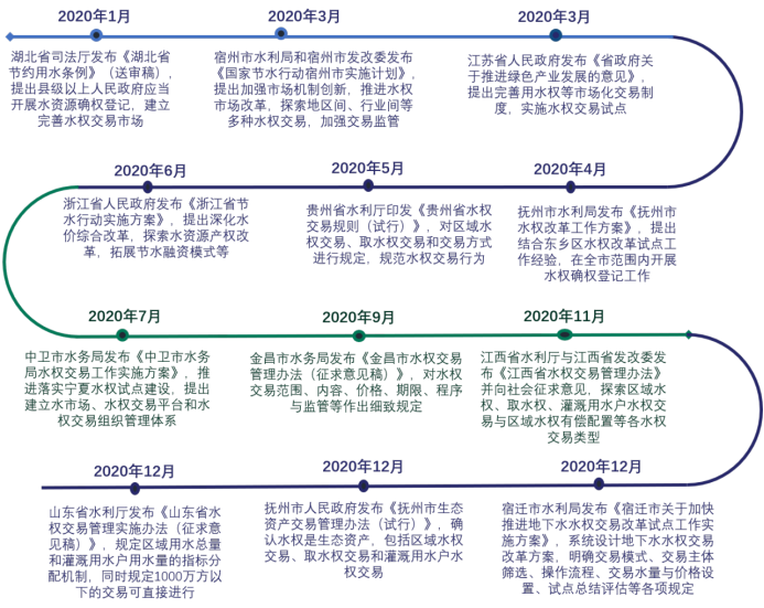 相比2019年,2020年全國地方級(jí)政策出臺(tái)進(jìn)度明顯加快,水權(quán)制度設(shè)計(jì)進(jìn)一步優(yōu)化。不僅有多個(gè)省著手進(jìn)行水權(quán)的確權(quán)登記工作,將區(qū)域水權(quán)、取水權(quán)和灌溉用水戶水權(quán)交易納入相關(guān)政策規(guī)定,也有部分省份進(jìn)行制度創(chuàng)新,如江西省將區(qū)域水權(quán)有償配置納入水權(quán)交易范疇,對(duì)部分水權(quán)進(jìn)行行政區(qū)域內(nèi)的有償分配,進(jìn)一步提高水資源價(jià)值;浙江省進(jìn)一步提出將探索水價(jià)綜合改革、拓展節(jié)水融資模式,拓寬水權(quán)價(jià)值實(shí)現(xiàn)范疇;宿遷市出臺(tái)水權(quán)改革方案,對(duì)地下水取水權(quán)交易的各項(xiàng)規(guī)定進(jìn)行明確規(guī)定,對(duì)水權(quán)交易納入新產(chǎn)品提供制度參考。