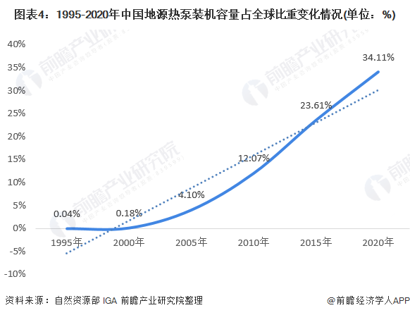 從裝機(jī)容量占全球總量的比重看,國內(nèi)地源熱泵裝機(jī)容量占比已從1995年的0.04%上升到2015年的23.61%,2020年國內(nèi)地源熱泵裝機(jī)容量占全球的比重上升到34.11%,且增長速度持續(xù)加快。