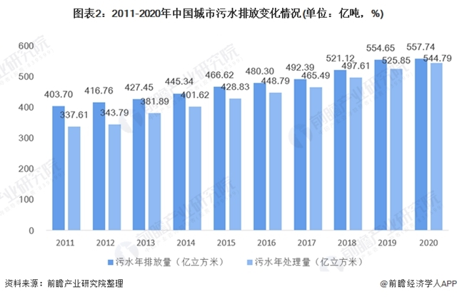 2011年我國城市污水排放量為304.7億立方米,同年污水年處理量為337.61億立方米,未處理的廢水量達(dá)到66億立方米左右,而到了2020年,據(jù)前瞻初步估計,我國城市污水排放量約為557.74億立方米,污水年處理量約為544.79億立方米,未處理的廢水量約為13億立方米,相較于2011年減少53億立方米。