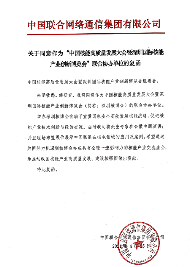 旨在宣貫國家安全高效發(fā)展核能戰(zhàn)略,落實(shí)中央堅(jiān)持聚焦能源數(shù)字化轉(zhuǎn)型的重大需求,促進(jìn)互聯(lián)網(wǎng)+與核電融合發(fā)展,打造“5G+智慧核電”模式,推動我國核電產(chǎn)業(yè)高質(zhì)量發(fā)展,為我國建設(shè)核電強(qiáng)國、能源強(qiáng)國貢獻(xiàn)力量,中國聯(lián)合網(wǎng)絡(luò)通信集團(tuán)有限公司(以下簡稱“中國聯(lián)通”)同意作為2021深圳核博會聯(lián)合協(xié)辦單位。