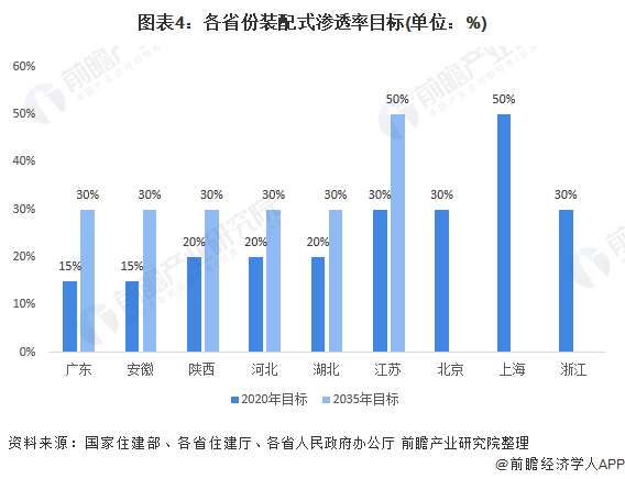 目前我國(guó)各地的政策也在大力支持裝配式施工方式的推廣。廣東、安徽、陜西等多數(shù)省份均對(duì)此設(shè)立了2035年滲透率達(dá)到30%的目標(biāo),北京、上海、江蘇、浙江等經(jīng)濟(jì)發(fā)達(dá)地區(qū)則更為嚴(yán)苛,分別設(shè)定了2020年滲透率達(dá)到30%、50%的目標(biāo)。隨著“碳達(dá)峰”“碳中和”政策的持續(xù)加碼,以數(shù)字化技術(shù)支持綠色環(huán)保的新型施工方式將有更大發(fā)展空間。