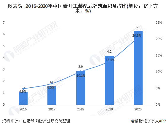 隨著各地積極推進(jìn)裝配式建筑項(xiàng)目落地,我國(guó)新建裝配式建筑規(guī)模不斷壯大。截至2020年末,全國(guó)31個(gè)省、自治區(qū)、直轄市和新疆生產(chǎn)建設(shè)兵團(tuán)新開(kāi)工裝配式建筑共計(jì)6.3億平方米,較2019年增長(zhǎng)50%,占新建建筑面積的比例約為20.5%。