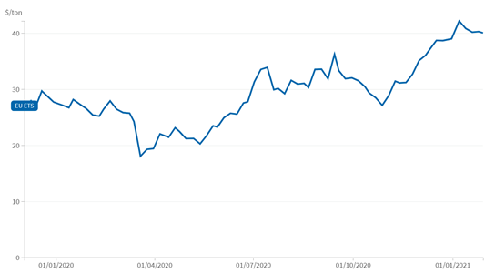 歐盟碳市場的穩(wěn)定結(jié)構(gòu)框架以及歐盟內(nèi)部長期政策的合理性在2020年的運行中得到較好體現(xiàn)。2020年是歐盟碳市場第三階段運行的最后一年,也是第四交易階段的密集準(zhǔn)備階段,碳價格在3、4月有短期大幅下降,從年初最高29.68美元降至4月最低18.04美元,但5月后價格又逐漸回升,并在7月達(dá)到33.89美元,此后一直在30美元左右徘徊,最后在同年12月達(dá)到42.16美元。在未來,歐盟《綠色新政》一攬子復(fù)蘇計劃以及《歐盟氣候法》中包含的2030年的新目標(biāo)將催生更大的氣候雄心,而碳市場的優(yōu)化改革將有助于實現(xiàn)這些氣候目標(biāo)。