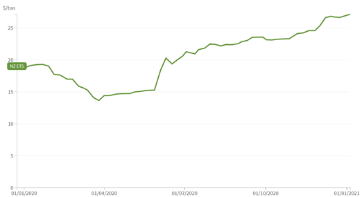 碳價格方面,新冠肺炎疫情期間,受制于經(jīng)濟(jì)緩滯,新西蘭碳配額價格從2020年1月的18.83美元降至3月14.35美元,后續(xù)逐步回升至年底的26.78美元。表明市場投資者意識到隨著碳排放上限的設(shè)定、固定價格期權(quán)的取消,碳市場需求將會進(jìn)一步提升。