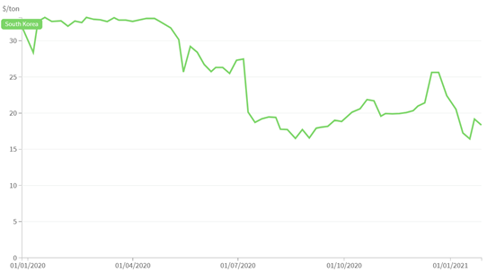 近兩年在韓國碳市場中,碳價持續(xù)處于波動狀態(tài)。2020年是韓國碳市場(K-ETS)運行第二階段的最后一年,受新冠疫情影響, 2020年的價格波動更加劇烈。碳價格在2020年4月初達(dá)到頂峰(35.92美元),然后從5月開始大幅下降至16.95美元,8月開始反彈至12月初達(dá)到25.84美元,12月末又有所回落(19.49美元)。2020年9月,韓國總統(tǒng)文在寅宣布將在2050年之前實現(xiàn)凈零排放的長期目標(biāo),預(yù)計將在未來幾年更新氣候政策框架,促進(jìn)對低碳技術(shù)的投資。
