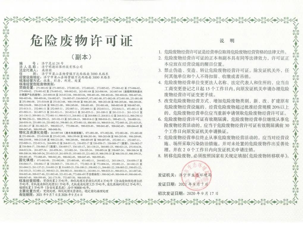 9月10日,雅居樂環(huán)保集團(tuán)旗下濟(jì)寧明德環(huán)??萍加邢薰?以下簡稱“濟(jì)寧明德項目”)喜獲濟(jì)寧市生態(tài)環(huán)境局頒發(fā)的5年期《危險廢物許可證》。這也是當(dāng)?shù)貎H有的兩張5年期《危險廢物許可證》之一。