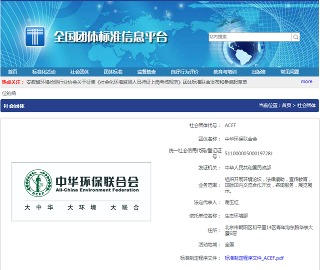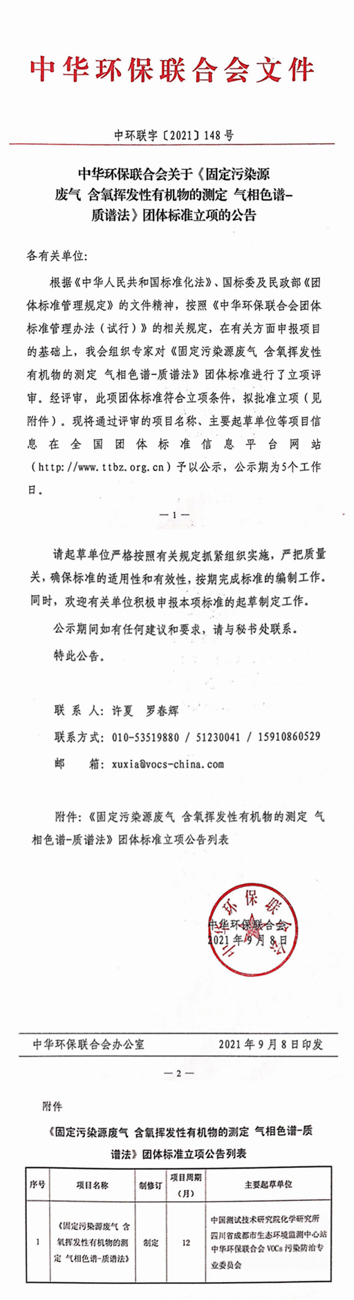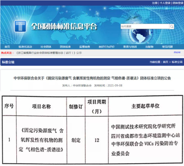 為了貫徹落實《中華人民共和國標準化法》、國務院《深化標準化工作改革方案》、國家標準化管理委員會和民政部印發(fā)的《團體標準管理規(guī)定》(國標委聯(lián)〔2019〕1號)的文件精神;按照《中華環(huán)保聯(lián)合會團體標準管理辦法(試行)》要求,經中華環(huán)保聯(lián)合會立項批準,由中國測試技術研究院化學研究所、四川省成都市生態(tài)環(huán)境監(jiān)測中心站和中華環(huán)保聯(lián)合會VOCs污染防治專業(yè)委員會等單位共同發(fā)起的全國團體標準《固定污染源廢氣 含氧揮發(fā)性有機物的測定 氣相色譜-質譜法》起草制定工作現已啟動;按照流程,標準項目信息已獲得全國團體標準信息平臺的立項公示。