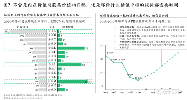 但必須承認(rèn)的是,向好趨勢的背后,我國資本市場的制度完善仍需時間。首先是生態(tài)環(huán)保企業(yè)內(nèi)在價值與股票價值的相匹配需要時間,在對生態(tài)環(huán)保企業(yè)2020年營收前15強(qiáng)的營收、ROIC加權(quán)和PE倍數(shù)進(jìn)行分析得到,多數(shù)企業(yè)(如企業(yè)A、E、I、M)的內(nèi)在價值與股票價值在資本市場上并不匹配。其次是生態(tài)環(huán)保估值中樞的提升仍需時日,盡管隨著國家政策的提振、生態(tài)環(huán)保行業(yè)的發(fā)展、部分細(xì)分行業(yè)企業(yè)現(xiàn)金流狀況的改善,環(huán)保估值中樞提升未來可期,但也并不是一蹴而就的(見圖7)。