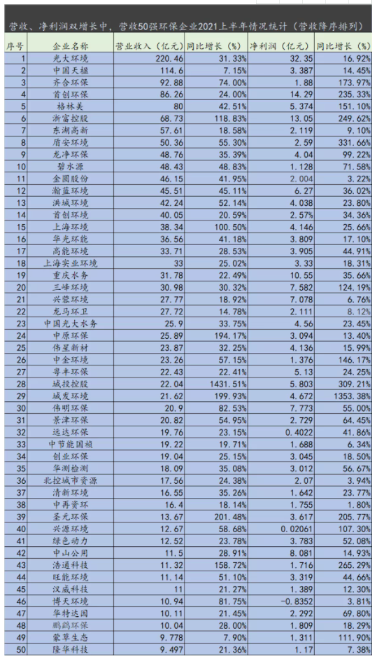 據不完全統(tǒng)計,2021年上半年近200家上市主營環(huán)保企業(yè)中營收和凈利雙增長企業(yè)共有122家,現(xiàn)對其中營收50強企業(yè)財務指標數據進行一一盤點。