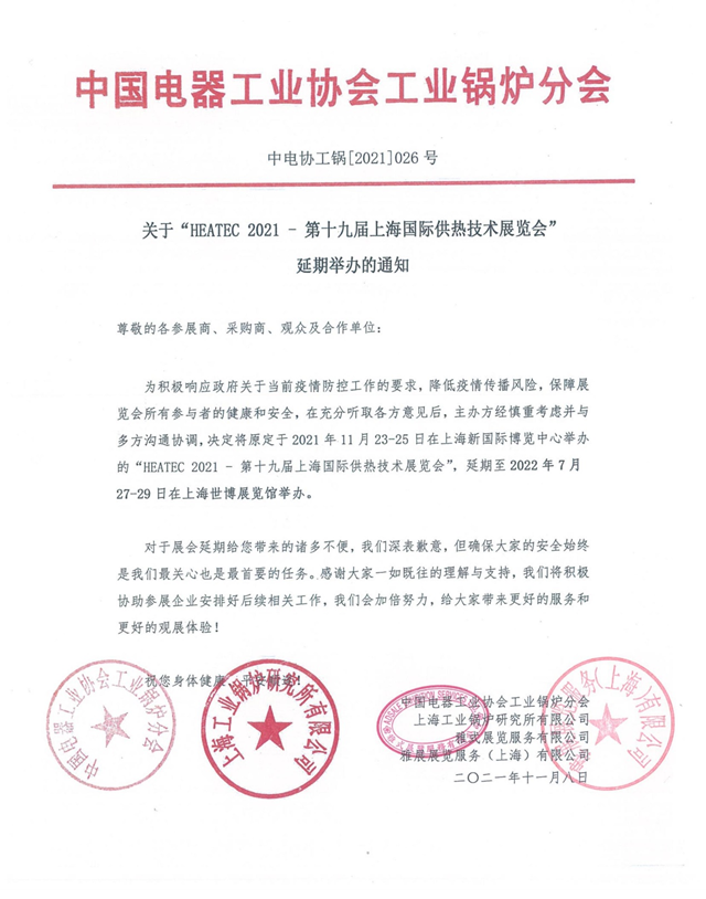 關(guān)于“HEATEC 2021 -第十九屆上海國際供熱技術(shù)展覽會”延期舉辦的通知