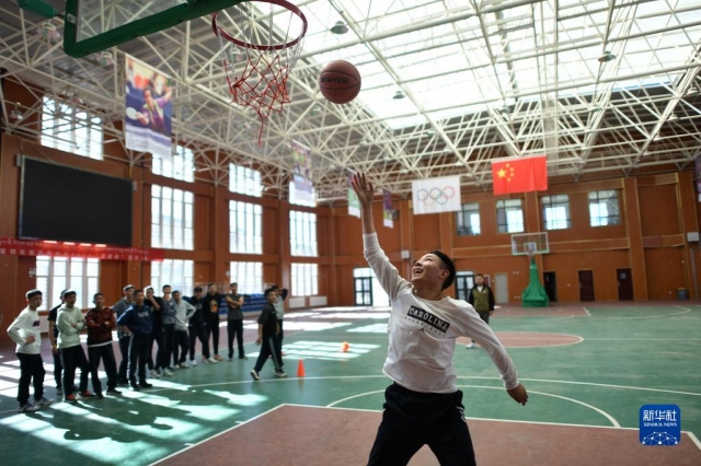 11月25日,青海省海南藏族自治州興??h民族高級中學學生在室內(nèi)籃球館訓練。新華社記者 駱曉飛 攝