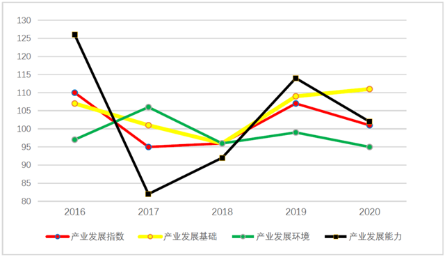 圖2“十三五”期間我國環(huán)保產業(yè)發(fā)展指數(shù)及一級指標變化趨勢