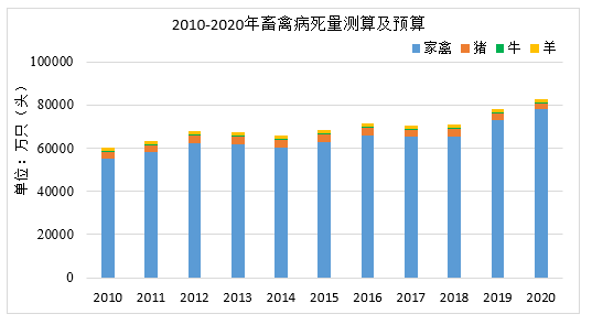根據(jù)國家統(tǒng)計局、農(nóng)業(yè)農(nóng)村部公開畜禽出欄量/存欄量數(shù)據(jù)測算病死量。養(yǎng)殖場的畜禽死亡率一般在5%~10%之間,若按5%計算,我國畜禽死亡量從2010年6.03億頭(只)增長至2020年的8.25億頭(只),復(fù)合增長率3%,其中家禽類占據(jù)大部分。由于2018年“非洲豬瘟”疫情我國累積撲殺近100萬頭生豬,實際死亡量可能高于預(yù)測數(shù)值。死畜禽攜帶大量的病原微生物,不僅污染環(huán)境,對于人體健康和畜禽養(yǎng)殖業(yè)的健康發(fā)展也存在嚴(yán)重威脅。因此,對死畜禽進行無害化處理是解決環(huán)境污染、實現(xiàn)畜牧業(yè)良性發(fā)展的必由之路。
