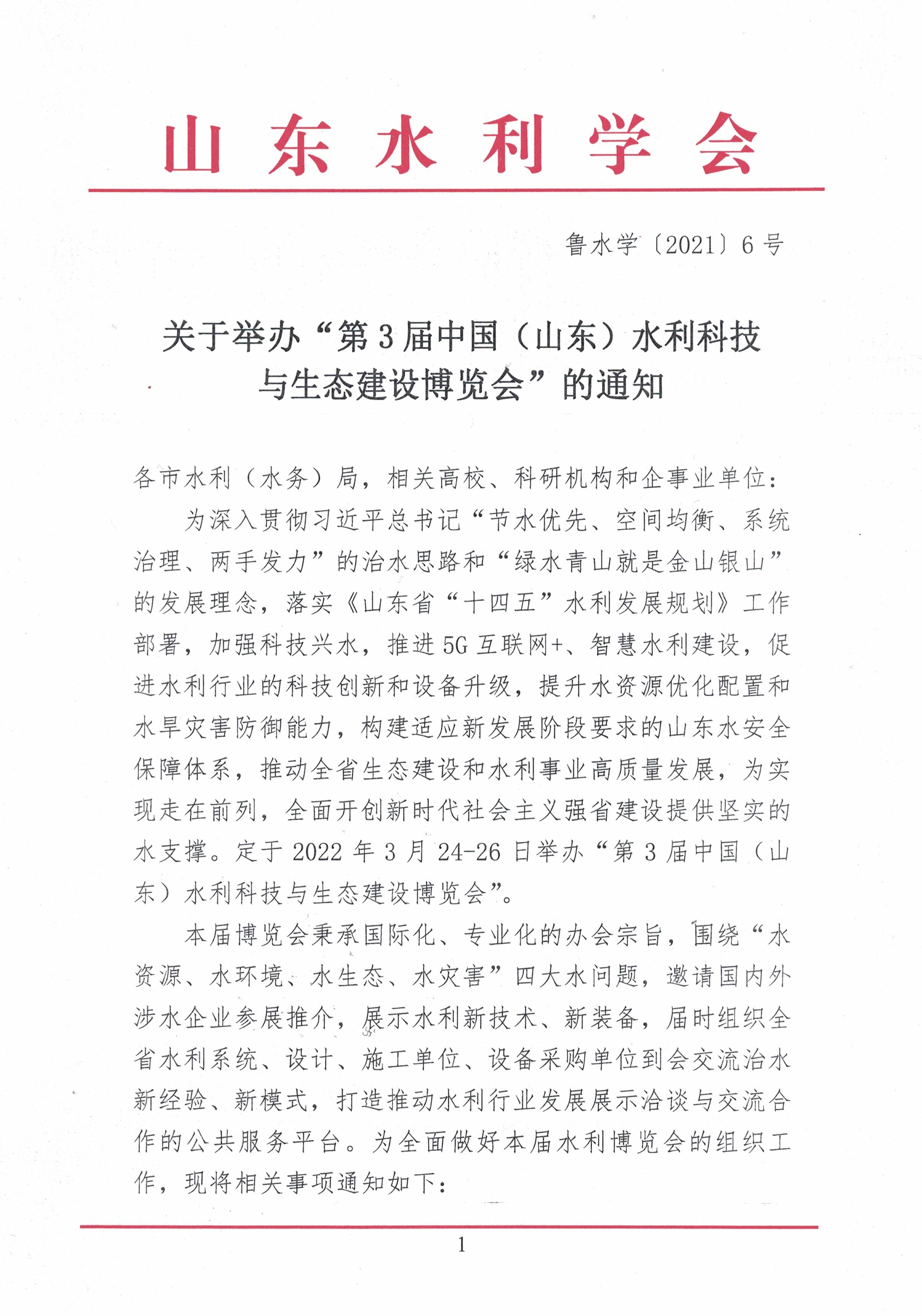 2021年12月6日,山東水利學(xué)會印發(fā)2021年6號文件,第3屆中國(山東)水利科技與生態(tài)建設(shè)博覽會的各項工作正式開始。誠邀各水利與生態(tài)建設(shè)相關(guān)企業(yè)報名參展,歡迎各水利同仁到會參觀。2022年3月24-26日,“紅瓦綠樹,碧海藍天”的青島歡迎您!