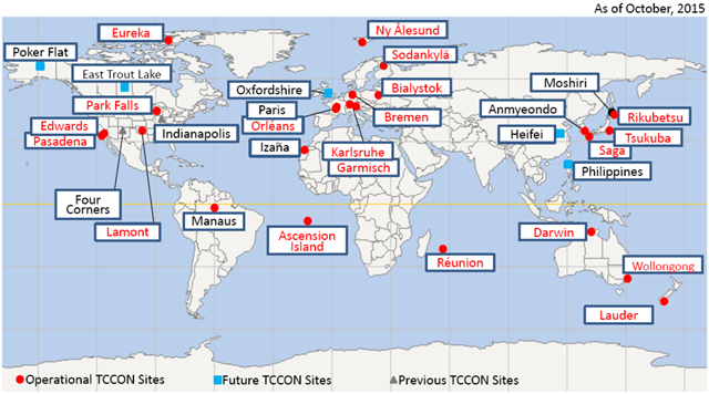 溫室氣體地基遙感探測(cè)的典型方法是高分辨率的FTIR技術(shù),監(jiān)測(cè)波段主要位于近紅外4000~11000cm-1波段,光譜分辨率可高達(dá)0.0095cm-1,它具有高精度、高準(zhǔn)確性以及連續(xù)測(cè)量等優(yōu)勢(shì),但高分辨的地基FTIR也具有相對(duì)較大的設(shè)備體積,建設(shè)成本較高。地基高分辨率FTIR光譜儀,簡(jiǎn)稱FTS。目前,全球碳柱總量觀測(cè)網(wǎng)(TCCON),就是基于FTS觀測(cè)平臺(tái),探測(cè)多種大氣溫室氣體的柱總量和垂直廓線,主要組分包括CO2、CH4、N2O、CO、H2O、HDO。該網(wǎng)絡(luò)建立了嚴(yán)格的數(shù)據(jù)采集與反演標(biāo)準(zhǔn),可用于研究全球的碳循環(huán),也可為衛(wèi)星的校準(zhǔn)提供標(biāo)準(zhǔn)數(shù)據(jù)庫(kù)。目前TCCON在全球已有二十多個(gè)站點(diǎn),具體分布如下圖3所示。