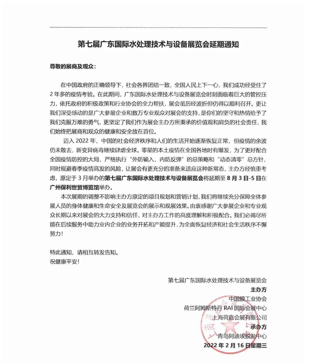 原定于2022年3月31-4月2日在廣州保利世貿(mào)博覽館舉辦的第七屆廣東水展將延期至2022年8月3日-5日。場館地址不變,特作出以下公告,對于延期給您帶來的不便深表歉意。