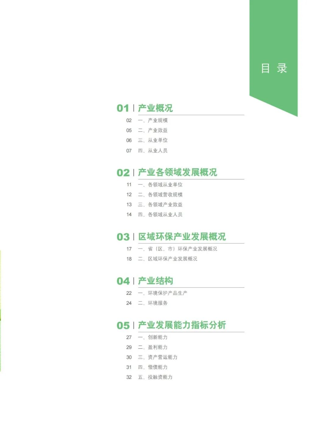 四、產(chǎn)業(yè)結(jié)構(gòu)2020年,列入全國環(huán)保產(chǎn)業(yè)重點(diǎn)企業(yè)基本情況調(diào) 查和全國環(huán)境服務(wù)業(yè)財(cái)務(wù)統(tǒng)計(jì)的15193家企業(yè)中,有 2088家企業(yè)從事環(huán)境保護(hù)產(chǎn)品生產(chǎn)活動,有13799家企 業(yè)從事環(huán)境服務(wù)活動。其中,有1394家環(huán)境保護(hù)產(chǎn)品 生產(chǎn)專營企業(yè),占比9.2%;13105家環(huán)境服務(wù)專營企 業(yè),占比86.3%;694家環(huán)境保護(hù)產(chǎn)品生產(chǎn)及環(huán)境服務(wù) 兼營企業(yè),占比4.5%。 1394家環(huán)境保護(hù)產(chǎn)品生產(chǎn)專營企業(yè)實(shí)現(xiàn)營業(yè)收入 701.7億元,環(huán)保業(yè)務(wù)營業(yè)收入504.5億元,營業(yè)利潤 59.1億元,利潤率8.4%,吸納就業(yè)人員75529人。與 2019年相比,2020年環(huán)境保護(hù)產(chǎn)品生產(chǎn)專營相同樣本 企業(yè)的營業(yè)收入增長了1.5%,環(huán)保業(yè)務(wù)營業(yè)收入增長 了8.6%,營業(yè)利潤下降了2.7%,從業(yè)人員數(shù)量增加了 0.4%,利潤率由8.7%降至8.3%。13105家環(huán)境服務(wù)專營企業(yè)實(shí)現(xiàn)營業(yè)收入6974.9億 元,環(huán)保業(yè)務(wù)營業(yè)收入5203.8億元,營業(yè)利潤545.4億 元,利潤率7.8%,吸納就業(yè)人員744420人。與2019年 相比,2020年環(huán)境服務(wù)專營相同樣本企業(yè)的營業(yè)收入 增長了10.0%,環(huán)保業(yè)務(wù)營業(yè)收入增長了7.5%,營業(yè) 利潤增長了1.7%,從業(yè)人員數(shù)量增加了5.2%,利潤率 由8.5%降至7.9%。 694家環(huán)境保護(hù)產(chǎn)品生產(chǎn)及環(huán)境服務(wù)兼營企業(yè)實(shí) 現(xiàn)營業(yè)收入977.0億元,環(huán)保業(yè)務(wù)營業(yè)收入525.2億元, 營業(yè)利潤71.3億元,利潤率7.3%,吸納就業(yè)人員52782 人。與2019年相比,2020年環(huán)境保護(hù)產(chǎn)品生產(chǎn)及環(huán)境 服務(wù)兼營相同樣本企業(yè)的營業(yè)收入增長48.9%,環(huán)保 業(yè)務(wù)營業(yè)收入增長了19.2%,營業(yè)利潤增長了22.6%, 從業(yè)人員增加了8.1%,利潤率由8.4%降至6.9%。五、產(chǎn)業(yè)發(fā)展能力指標(biāo)分析從創(chuàng)新能力看,與2019年相比,2020年相同樣 本企業(yè)研發(fā)經(jīng)費(fèi)支出占比同比保持穩(wěn)定,企業(yè)平均研 發(fā)經(jīng)費(fèi)同比增長,環(huán)境監(jiān)測領(lǐng)域增幅較大,企業(yè)平均 專利授權(quán)數(shù)量同比小幅增長,企業(yè)參與制修訂的標(biāo)準(zhǔn) 平均數(shù)量同比持平。相同樣本企業(yè)研發(fā)人員數(shù)同比微增,研發(fā)人員占從業(yè)人員比重小幅下降。但與作為戰(zhàn) 略性新興產(chǎn)業(yè)和享受高新技術(shù)企業(yè)待遇的行業(yè)應(yīng)擔(dān)負(fù) 的科技創(chuàng)新發(fā)展責(zé)任相比,環(huán)保企業(yè)還應(yīng)進(jìn)一步加大 研發(fā)投入力度。 從盈利能力看,2020年環(huán)保企業(yè)凈資產(chǎn)收益率相 對較低。與2019年相比,相同樣本企業(yè)凈資產(chǎn)收益率 同比下降,利潤率同比基本保持穩(wěn)定。反映2020年我 國環(huán)保企業(yè)資產(chǎn)收益能力有所下降。從資產(chǎn)營運(yùn)能力看,2020年環(huán)保企業(yè)總資產(chǎn)周轉(zhuǎn) 率較低,應(yīng)收賬款周轉(zhuǎn)率相對較差,與2019年相比, 2020年相同樣本企業(yè)總資產(chǎn)周轉(zhuǎn)率、應(yīng)收賬款周轉(zhuǎn)率 均保持穩(wěn)定。反映環(huán)保企業(yè)的資產(chǎn)營運(yùn)能力保持穩(wěn)定,但回款問題仍較突出。 從償債能力看,2020年環(huán)保企業(yè)資產(chǎn)負(fù)債水平總 體處于中等水平。與2019年相比,2020年相同樣本企 業(yè)資產(chǎn)負(fù)債率平均值同比下降1個百分點(diǎn),為58.7%, 總體處于合理區(qū)間。 從投融資能力看,2020年,水污染防治、固廢處理處置與資源化領(lǐng)域依然為年度環(huán)保產(chǎn)業(yè)投資熱點(diǎn)領(lǐng) 域。與2019年相比,2020年相同樣本企業(yè)投資額同比增長明顯。固體廢物處理處置與資源化、土壤修復(fù)領(lǐng)域企業(yè)投資額同比增幅較大。環(huán)保產(chǎn)業(yè)融資依然以銀 行及信用社貸款為代表的間接融資方式為主,企業(yè)融 資額同比大幅增長。 總體來看,2020年,我國環(huán)保產(chǎn)業(yè)創(chuàng)新能力有所增強(qiáng),盈利水平略有下滑,資產(chǎn)營運(yùn)能力保持穩(wěn)定, 資產(chǎn)負(fù)債水平處于合理區(qū)間,但回款問題仍較突出, 成本壓力呈加大趨勢。 點(diǎn)擊文末“閱讀原文”查看完整版報告