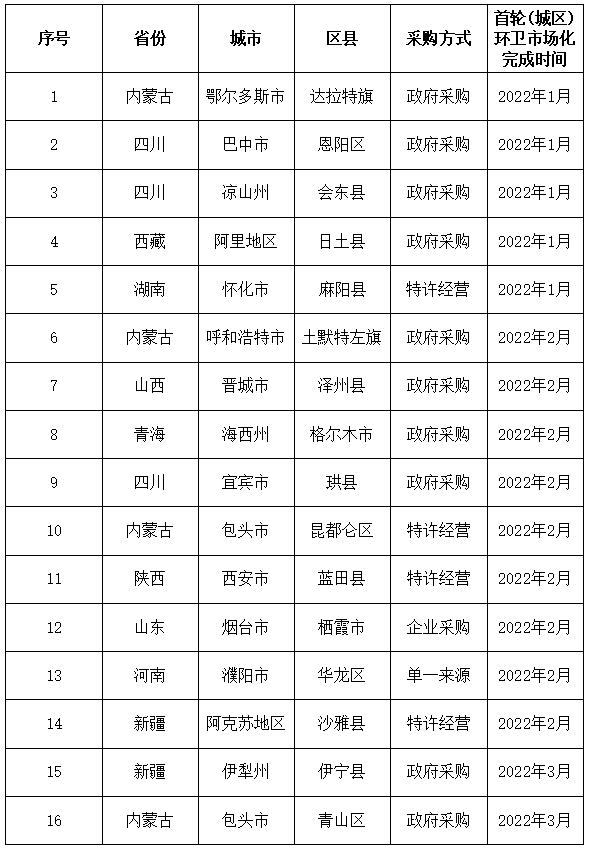 截止2021年12月31日,全國完成城區(qū)(首輪)環(huán)衛(wèi)市場化改革的區(qū)縣數(shù)量為2006個,城區(qū)環(huán)衛(wèi)市場化率為70.34%。進一步的數(shù)據(jù)分析顯示,在2022年度完成首輪環(huán)衛(wèi)市場化改革的16個區(qū)縣,采取“非政府采購”方式的區(qū)縣占比達到37%,接近四成。在采取“非政府采購”方式的6個區(qū)縣中,其中:采取“特許經(jīng)營”方式的區(qū)縣有4個,采取“企業(yè)采購”和“單一來源采購”方式的區(qū)縣各1個。附1:2022年度完成城區(qū)環(huán)衛(wèi)市場化(16個)區(qū)縣分布附2:2022年度完成城區(qū)環(huán)衛(wèi)市場化區(qū)縣具體明細(xì)