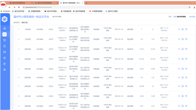 溫州市小微危廢統(tǒng)一收運(yùn)云平臺(tái)截圖