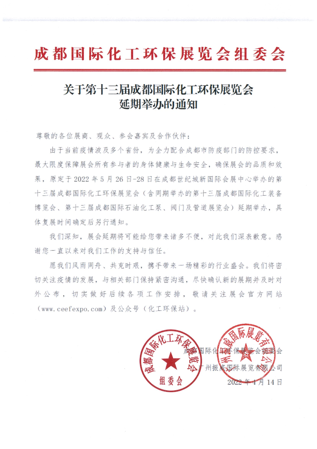 由于當(dāng)前疫情波及多個(gè)省份,為全力配合成都市防疫部門的防控要求,最大限度保障展會(huì)所有參與者的身體健康與生命安全,確保展會(huì)的品質(zhì)和效果,原定于2022年5月26日-28日在成都世紀(jì)城新國(guó)際會(huì)展中心舉辦的第十三屆成都國(guó)際化工環(huán)保展覽會(huì)(含同期舉辦的第十三屆成都國(guó)際化工裝備博覽會(huì)、第十三屆成都國(guó)際石油化工泵、閥門及管道展覽會(huì))延期舉辦,具體復(fù)展時(shí)間確定后另行通知。