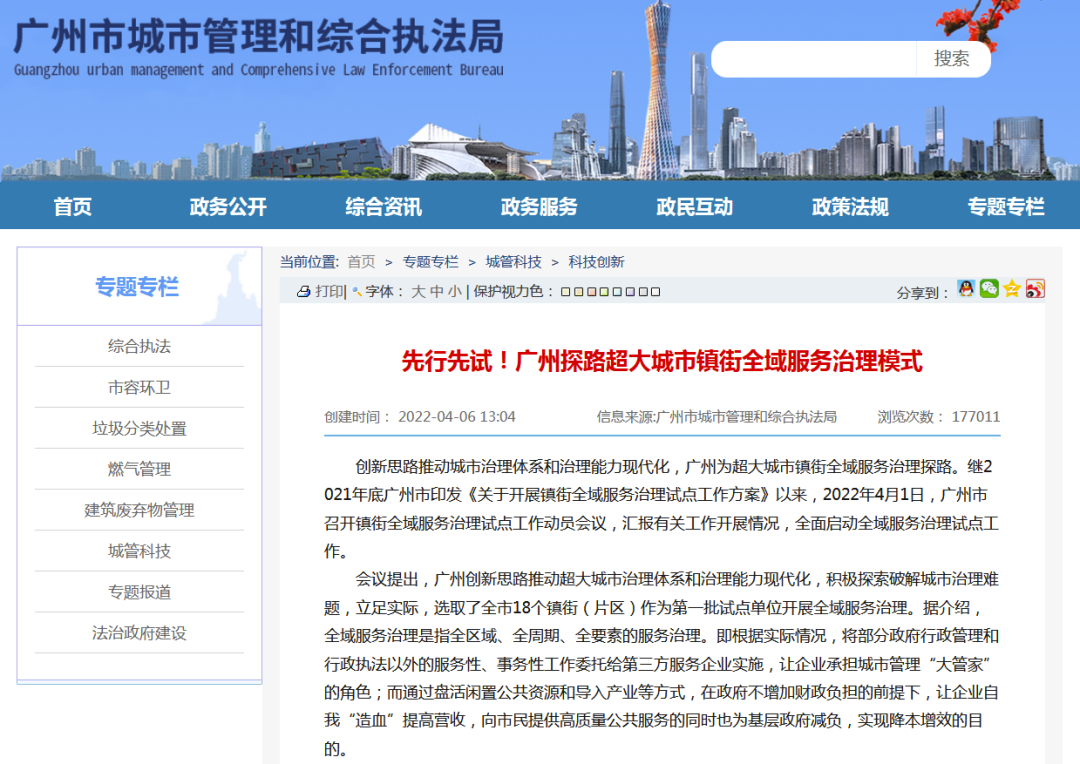 創(chuàng)新思路推動(dòng)城市治理體系和治理能力現(xiàn)代化,廣州為超大城市鎮(zhèn)街全域服務(wù)治理探路。鳳凰網(wǎng)廣東自市城市管理綜合執(zhí)法局獲悉,繼2021年底廣州市印發(fā)《關(guān)于開展鎮(zhèn)街全域服務(wù)治理試點(diǎn)工作方案》以來,2022年4月1日,廣州市召開鎮(zhèn)街全域服務(wù)治理試點(diǎn)工作動(dòng)員會(huì)議,匯報(bào)有關(guān)工作開展情況,全面啟動(dòng)全域服務(wù)治理試點(diǎn)工作。