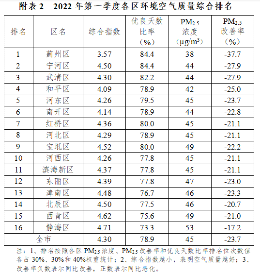2022年第一季度,各區(qū)PM2.5濃度在38——53µg/m3之間,優(yōu)良天數(shù)比率在73.0%——84.4%之間。按照PM2.5濃度、PM2.5改善率和優(yōu)良天數(shù)比率排名位次數(shù)值各占30%、30%和40%的權(quán)重進(jìn)行排名,第一季度排名較好的區(qū)為薊州區(qū)、寧河區(qū)和武清區(qū),較差區(qū)為靜海區(qū)、西青區(qū)和北辰區(qū)。