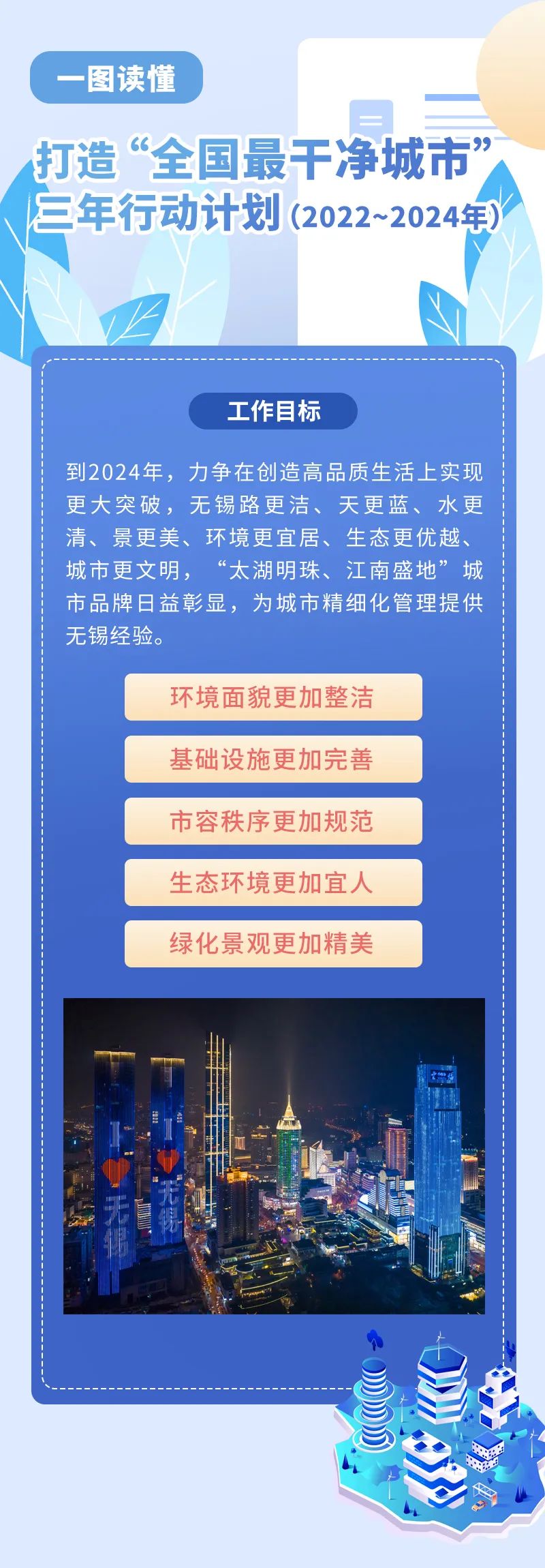 2020年9月,無錫首次提出了打造“全國最干凈城市”。全國部分城市也曾提過類似概念,但很多停留在市容整潔的層面上。市委、市政府提出打造“全國最干凈城市”目標,絕不是突發(fā)奇想,而是基于對無錫城市能級的總體考量、對城市規(guī)模的理性認識、對城市管理現(xiàn)狀的準確把握,無錫應(yīng)當也可以朝著“全國最干凈城市”方向努力。一座城市,三分靠建設(shè)、七分靠管理,而城市管理,不僅講技術(shù),還要講藝術(shù)。根據(jù)過往幾年治理經(jīng)驗的整合優(yōu)化,無錫市發(fā)布了打造“全國最干凈城市”三年行動計劃。可以說,“無錫版本”領(lǐng)域更廣闊、要素更充實、指標更多樣,實施過程中還會根據(jù)實際需求進行動態(tài)調(diào)整。 打造“全國最干凈城市”,無錫提出了5個方面的目標。