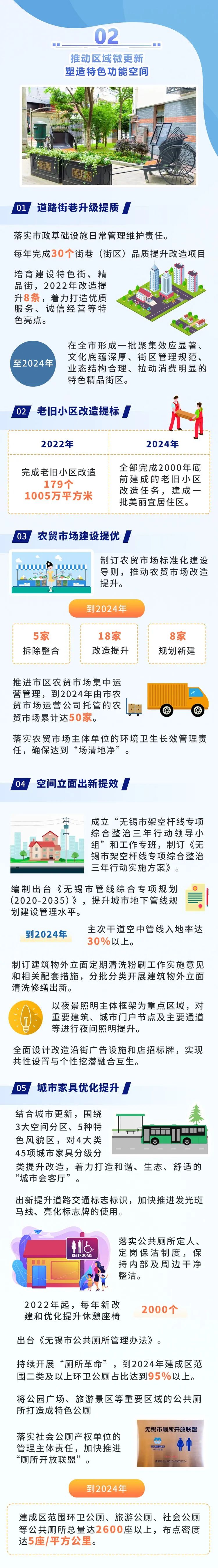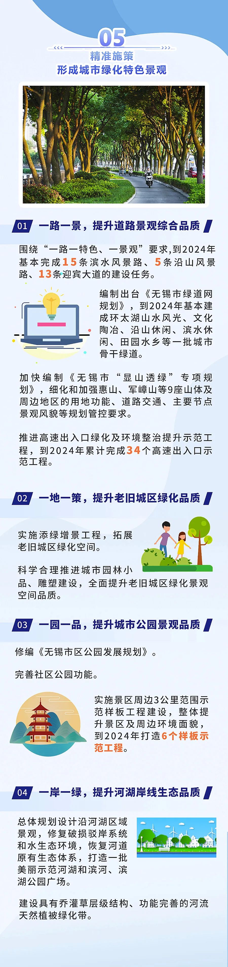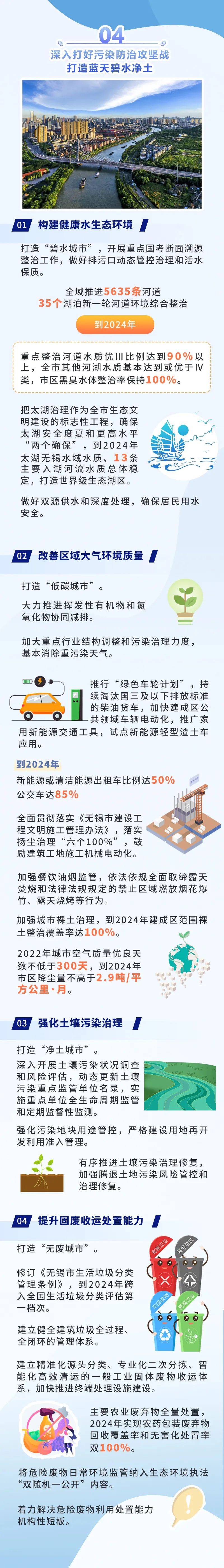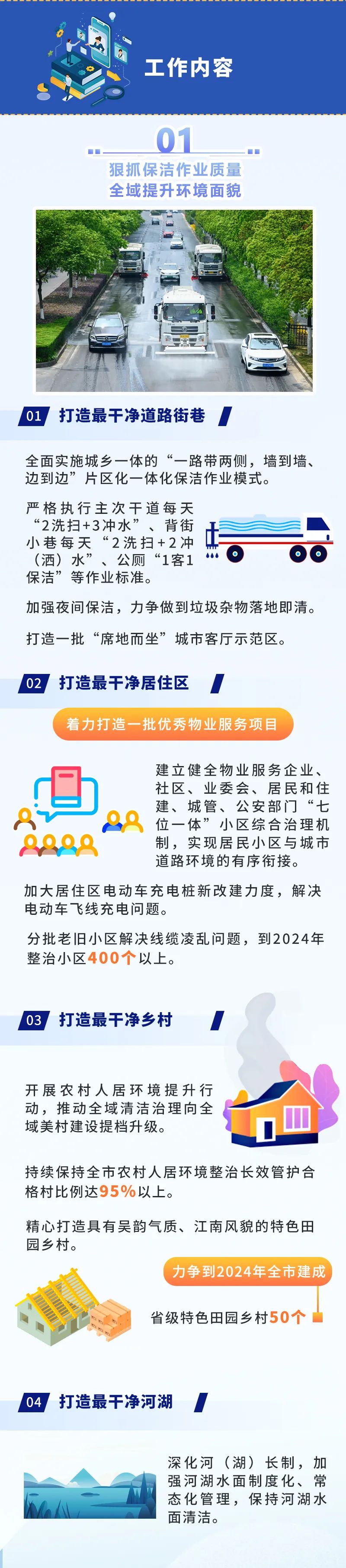 ●環(huán)境面貌更加整潔。到2024年,全市主次干道潔凈度100%、背街小巷潔凈度90%、河湖水面潔凈度100%、綠化區(qū)域潔凈度100%、小區(qū)環(huán)境潔凈度90%,打造“席地而坐”城市客廳示范區(qū)100個。●基礎(chǔ)設(shè)施更加完善。2000年底前建成的老舊小區(qū)改造率100%,完成街巷(街區(qū))品質(zhì)提升改造項目100個,建成區(qū)一類環(huán)衛(wèi)公廁比例25%;基礎(chǔ)設(shè)施管養(yǎng)到位,主要道路黑色化、標線本色化95%,人行道板完好率95%,路燈設(shè)施亮燈率99%,戶外廣告設(shè)施整潔完好率95%,城市家具清潔完好率98%。●市容秩序更加規(guī)范。市區(qū)道路停車泊位管理覆蓋率100%,三亂小廣告治理覆蓋率100%,市容環(huán)衛(wèi)責任區(qū)履約率100%,顯見性市容違法行為“動態(tài)清零”。●生態(tài)環(huán)境更加宜人。重污染天氣基本消除,空氣質(zhì)量優(yōu)良天數(shù)比例達到82%以上,PM2.5年均濃度達到27微克/立方米;城市黑臭水體全面消除,地表水國省考斷面優(yōu)Ⅲ比例達到90%以上;土壤環(huán)境風險有效管控,重點建設(shè)用地安全利用率達到100%;固體廢棄物無害化處置率、資源化利用率達到和保持全國領(lǐng)先水平,城鄉(xiāng)生活垃圾分類覆蓋率100%,保持生活垃圾無害化處理率100%,生活垃圾回收利用率36%,一般工業(yè)固廢綜合利用率98%。●綠化景觀更加精美。高品質(zhì)建設(shè)和改造提升城市綠化,形成有特色、有人文、生態(tài)化的景觀新風格,建成區(qū)綠化覆蓋率達到43%,人均公園綠地面積達到14.9平方米,萬人擁有綜合公園指數(shù)≥0.06,公園綠地10分鐘服務(wù)圈覆蓋率達到90%,建設(shè)城市骨干綠道100公里,建成國家生態(tài)園林城市。打造“全國最干凈城市”,不是空洞的口號、不是泛化的要求,而要體現(xiàn)在具體落實和實際效果上。打造可觀可感的“物之美”。全市每年完成30個街巷(街區(qū))品質(zhì)提升改造項目,培育建設(shè)特色街、精品街;到2024年,主次干道空中管線入地率達30%以上;全面設(shè)計改造沿街廣告設(shè)施和店招標牌,實現(xiàn)共性設(shè)置與個性挖潛融合互生;對4大類45項城市家具分級分類提升改造,著力打造和諧、生態(tài)、舒適的“城市會客廳”,每年新改建和優(yōu)化提升休憩座椅2000個,使生態(tài)業(yè)態(tài)、風格風貌、家具小品等城市要素與周邊環(huán)境、人文特色相得益彰,城市亮化、城市更新、基礎(chǔ)設(shè)施建設(shè)等方方面面精彩紛呈,讓人情不自禁“會心一笑”。打造無所不在的“凈之美”。路面平整衛(wèi)生、干凈清爽,街區(qū)秩序井然、席地可坐,公共空間長治久潔,地下空間集約高效,垃圾分類蔚然成風,城市中的細節(jié)與質(zhì)感詮釋著美好生活該有的模樣。城市干凈不干凈,“席地而坐”是一個標準。通過打造最干凈道路街巷、打造最干凈居住區(qū)、打造最干凈鄉(xiāng)村、打造最干凈河湖,建成“席地而坐”城市客廳示范區(qū)100個,實現(xiàn)居民小區(qū)與城市道路環(huán)境的有序銜接,使省級特色田園鄉(xiāng)村達到50個。 打造詩意棲居的“景之美”。一路一景,提升道路景觀綜合品質(zhì);一地一策,提升老舊城區(qū)綠化品質(zhì);一園一品,提升城市公園景觀品質(zhì);一岸一綠,提升河湖岸線生態(tài)品質(zhì)。到2024年,全市基本完成15條濱水風景路、5條沿山風景路、13條迎賓大道的建設(shè)任務(wù);重點整治河道水質(zhì)優(yōu)Ⅲ比例達到90%以上,太湖無錫水域水質(zhì)、13條主要入湖河流水質(zhì)總體穩(wěn)定,打造世界級生態(tài)湖區(qū);還要進入全國生活垃圾分類評估第一檔次,打造“無廢城市”。屆時,藍天綠地、銜山抱水的“大生態(tài)”格局基本形成,春能見花、夏能見綠、秋能見果、冬能見青的公園城市觸手可及,為生活、工作在其中的市民增添更多暖意、愜意、詩意。
