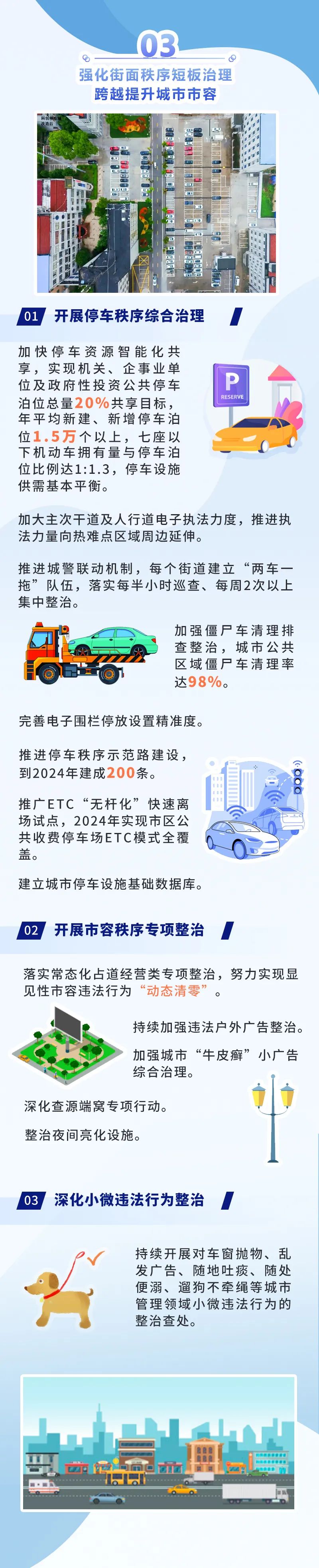 打造和諧文明的“治之美”。強化街面秩序短板治理,開展停車秩序綜合治理、市容秩序?qū)m椪?,深化小微違法行為整治,跨越提升城市市容。全市實現(xiàn)年平均新建、新增停車泊位1.5萬個以上,七座以下機動車擁有量與停車泊位比例達1∶1.3,停車設(shè)施供需基本平衡。實時感知、快速響應(yīng)、高效處置的數(shù)字化治理模式加快構(gòu)建,社會文明程度達到全國文明典范城市標準,近悅遠來、安居樂業(yè)、流連忘返、心向往之的“全國最干凈城市”成為無錫最閃亮的城市名片。 “全國最干凈城市”目標,不僅有外在干凈的形象也有內(nèi)在文明的氣質(zhì),不僅關(guān)系著城市發(fā)展也影響著城市美譽度,絕不是城管局一個部門的事,也不單單是城管范疇,是一個體現(xiàn)城市綜合實力的概念,是一個條塊聯(lián)動、條線互動的體系。