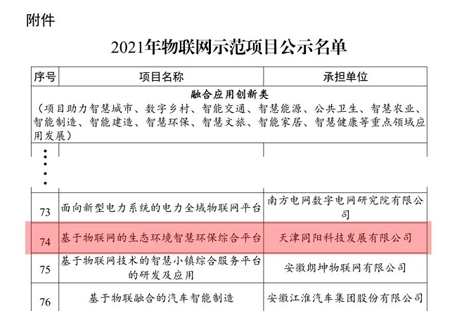 近日,工信部發(fā)布了2021年物聯網示范項目名單,同陽科技的《基于物聯網的生態(tài)環(huán)境智慧環(huán)保綜合平臺》強勢入圍。