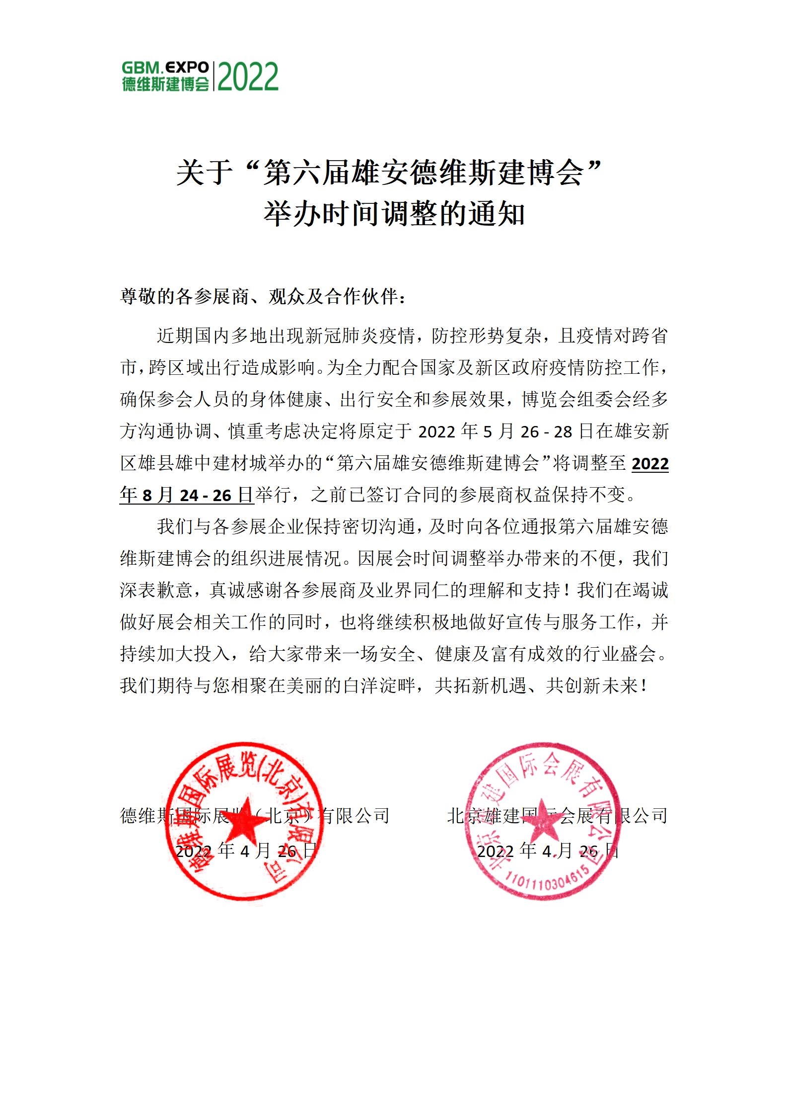 關于“第六屆雄安德維斯建博會”舉辦時間調(diào)整的通知