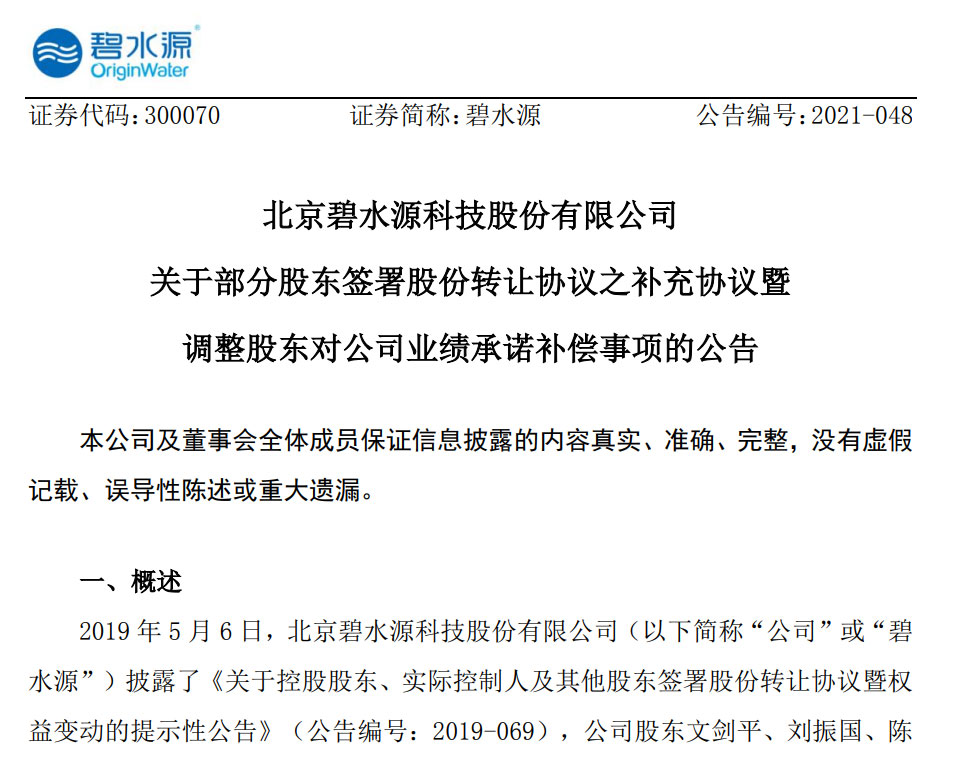 6、《關(guān)于部分股東簽署股份轉(zhuǎn)讓協(xié)議之補(bǔ)充協(xié)議暨調(diào)整股東對(duì)公司業(yè)績承諾事項(xiàng)的公告》,碧水源,2021-03-31