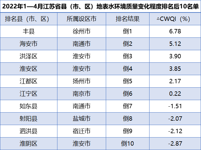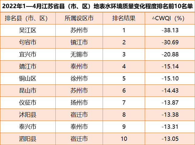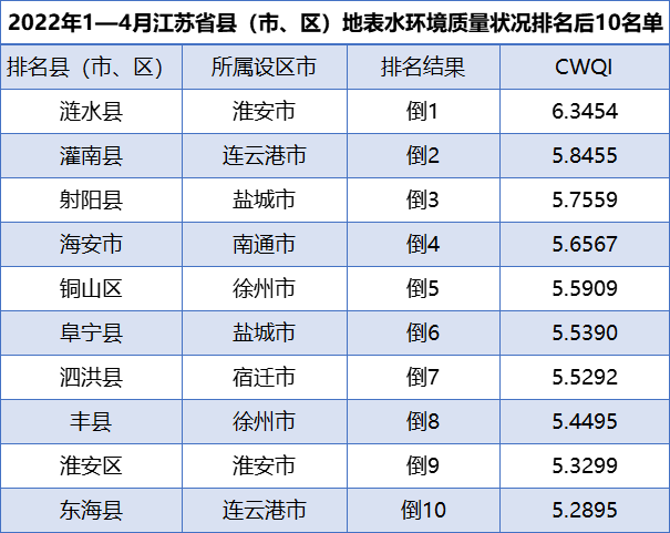原標題:2022年1—4月江蘇省縣(市、區(qū))地表水環(huán)境質(zhì)量排名