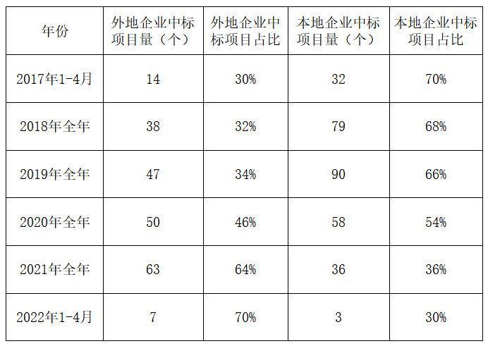 這里所說的本地企業(yè),是指項(xiàng)目中標(biāo)公司注冊地在本省的企業(yè),反之,則成為外地企業(yè)。如北京環(huán)境有限公司在北京市中標(biāo)項(xiàng)目,就是本地企業(yè),在貴州省中標(biāo)項(xiàng)目,就是外地企業(yè)。