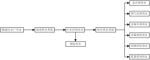 因臨港污水廠的毗鄰企業(yè)——上海天漢環(huán)境資源有限公司地處供水網(wǎng)絡(luò)末端且其日常工業(yè)用水體量大,故經(jīng)雙方協(xié)商,臨港污水廠設(shè)置專用的中水泵房及輸送管線,將消毒后的最終出水作為中水供應(yīng)給天漢環(huán)境,并通過在線儀表實時監(jiān)控中水中的COD、氨氮、總磷、總氮、pH值等水質(zhì)指標(biāo),保障中水水質(zhì)的穩(wěn)定達(dá)標(biāo);天漢環(huán)境對中水進(jìn)行進(jìn)一步的處理并用于消防、冷卻塔、煙氣洗滌、設(shè)備冷卻、設(shè)備清洗、地面沖洗和藥劑配置等用途。