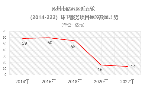 2014年59個(gè)標(biāo)段(開標(biāo)57個(gè)標(biāo)段,金閶十標(biāo)段、十四標(biāo)段廢標(biāo)),2016年60個(gè)標(biāo)段,2018年55個(gè)標(biāo)段,2020年16個(gè)標(biāo)段,2022年14個(gè)標(biāo)段。