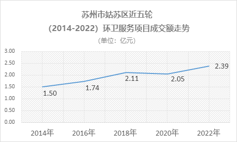 2014年(輪次)姑蘇區(qū)環(huán)衛(wèi)項(xiàng)目招標(biāo)成交額1.5億元/年,2022年(輪次)姑蘇區(qū)環(huán)衛(wèi)項(xiàng)目招標(biāo)成交額2.4億元/年,8年間,姑蘇區(qū)環(huán)衛(wèi)服務(wù)采購金額增加近9000萬元。其中,標(biāo)段平均年化額從2014年的255萬元上升到2022年的1593萬元,8年間上漲6倍多。