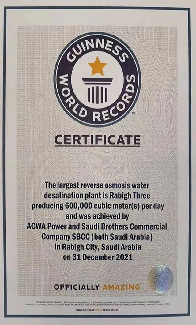 該項目位于沙特拉比格市,于去年12月,提前合同工期2個月投產(chǎn)。采用先進的反滲透技術(shù),日產(chǎn)水量60萬立方米,每天可向吉達、麥加等沙特主要城市200多萬戶居民和朝圣者提供基本生活用水,甘甜的淡水不僅滋養(yǎng)了穆斯林圣地,還促進了社會和旅游業(yè)發(fā)展。就在前不久,它還收到吉尼斯世界紀錄證書,成為世界最大單體反滲透海水淡化項目。