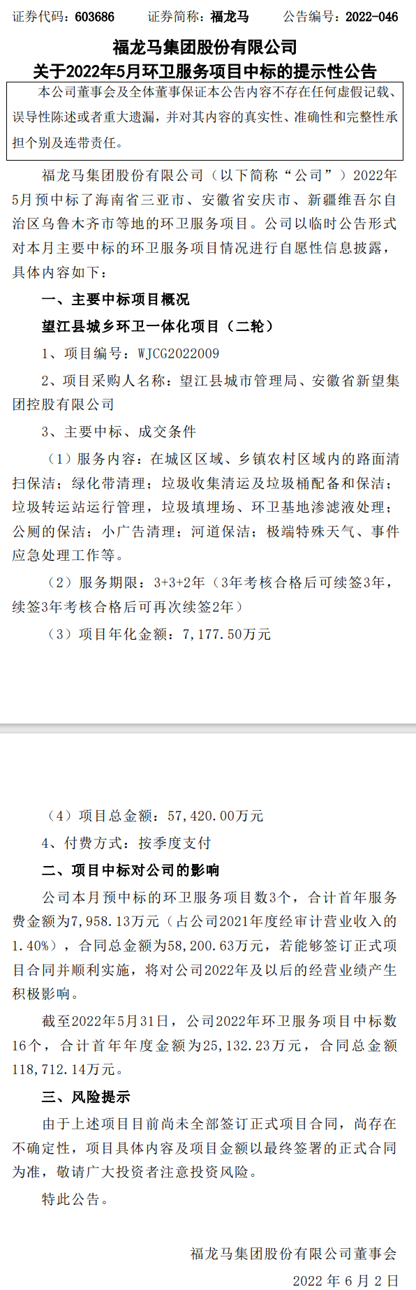 2022年6月2日,福龍馬集團(tuán)股份有限公司(下稱(chēng)“福龍馬”)發(fā)布“關(guān)于2022年5月環(huán)衛(wèi)服務(wù)項(xiàng)目中標(biāo)的提示性公告”。