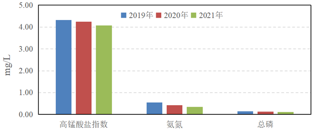 優(yōu)Ⅲ類水質斷面比例逐年上升,2021年示范區(qū)優(yōu)Ⅲ類水質斷面比例較2020年上升5.8個百分點,較2019年上升9.6個百分點;2021年氨氮和總磷平均濃度較2020年分別下降18.6%和6.3%,較2019年分別下降35.2%和14.4%;2019~2021年高錳酸鹽指數(shù)年均值基本持平。