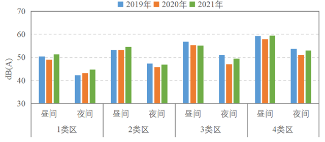2021年,示范區(qū)各類聲環(huán)境功能區(qū)監(jiān)測均值均達到相應的聲環(huán)境質量標準。2019~2021年示范區(qū)各類聲環(huán)境功能區(qū)監(jiān)測均值總體基本持平。