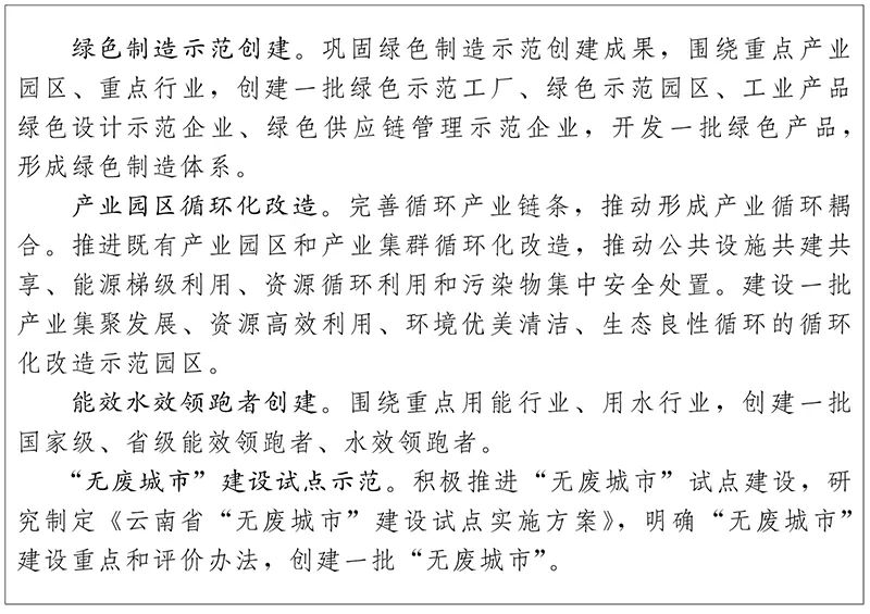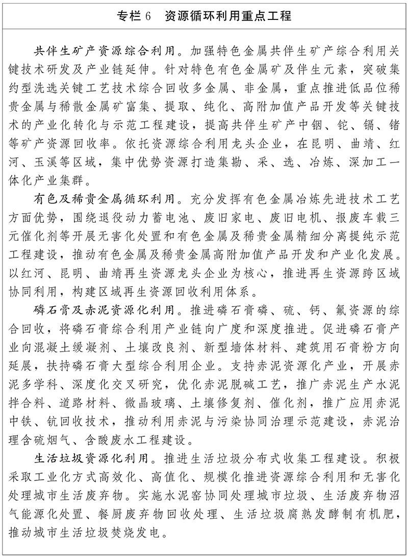 圍繞全省工業(yè)綠色發(fā)展工作重點(diǎn),以提高資源產(chǎn)出率為目標(biāo),大力推進(jìn)昆明、曲靖、玉溪、紅河等地區(qū)共伴生礦產(chǎn)資源綜合利用試點(diǎn)示范,實(shí)施鋼渣、磷石膏、粉煤灰等大宗工業(yè)固體廢物資源化示范工程,全面推進(jìn)生活垃圾分類收集,開展多元化生活垃圾終端處置工程和農(nóng)林廢棄物資源化項(xiàng)目,培育再生資源利用企業(yè),建立可再生資源循環(huán)利用體系,促進(jìn)再生資源清潔化回收,規(guī)模化利用和集聚化發(fā)展。